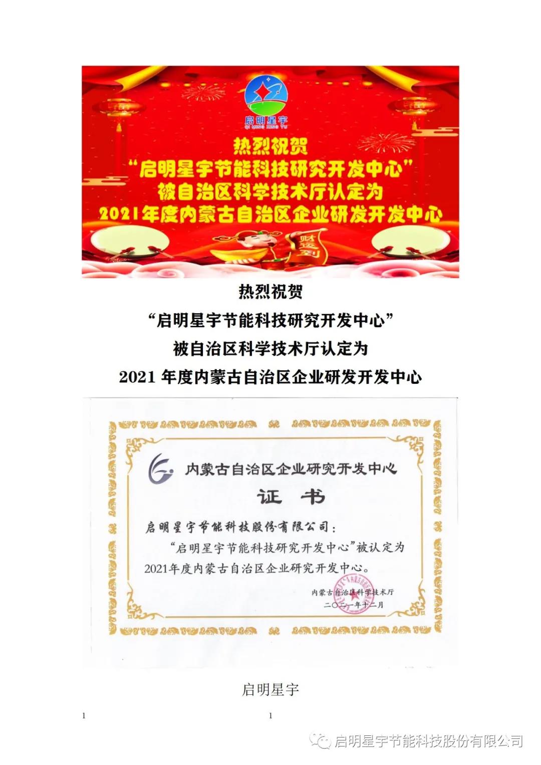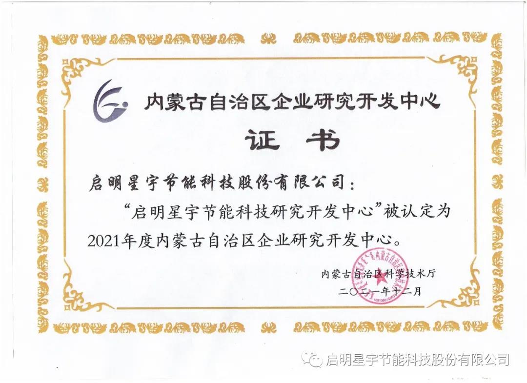 熱烈祝賀啟明星宇研發(fā)中心,升級(jí)為《2021內(nèi)蒙古自治區(qū)企業(yè)研發(fā)開(kāi)發(fā)中心》